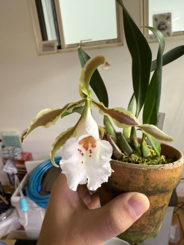 やっぱりダメだなと思い、素焼に水苔に変更しています。やや乾燥気味の維持をしていますが、無事花が咲きました(ちなみに、この花が終わった後に新芽も出てきました∩(・ω・)∩)。