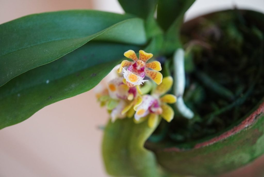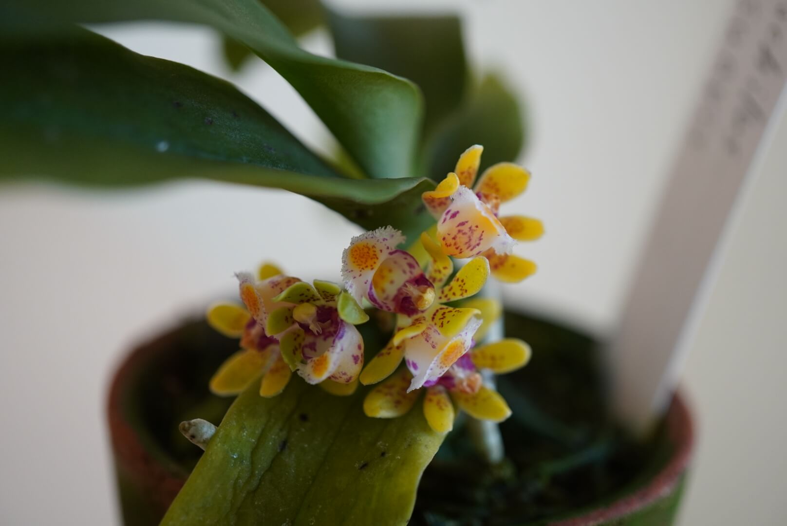 うちにはもう一鉢Gastrochilusがありますが、「水は欲しいんだけど、根っこは奥には潜りたくありません」という雰囲気でして、浅鉢にすべきなんですかね…。本来は板付けがお勧めなんでしょうけど、そうすると乾燥が強くなって枯らす未来しか見えてこない(^^;